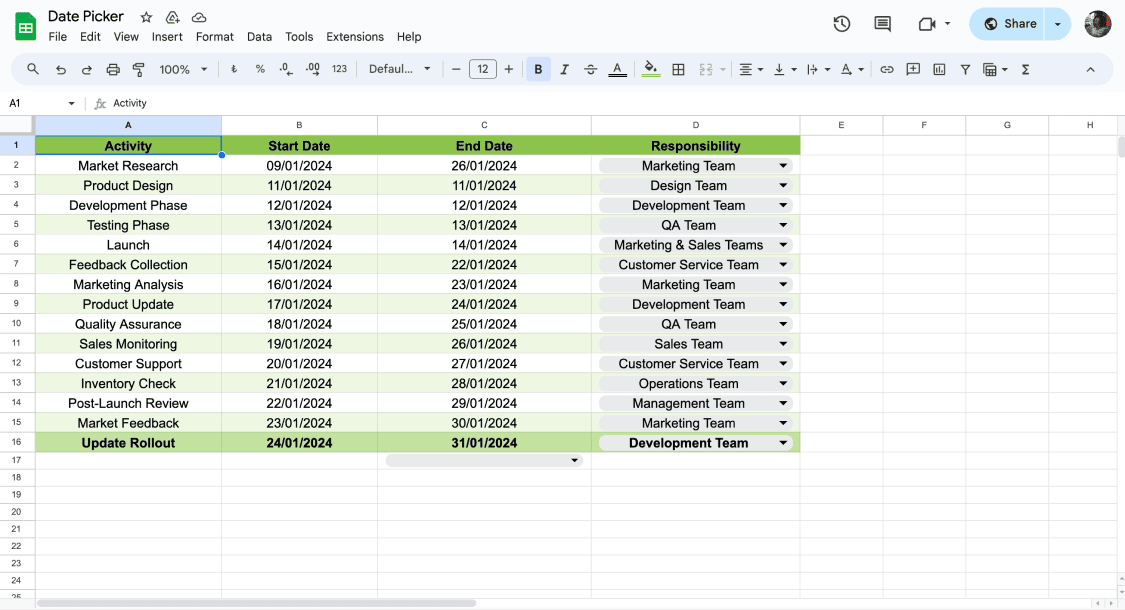 This feature reduces manual typing and minimizes errors. It’s especially useful for tracking deadlines, schedules, or timelines. You can also copy the formatted cell to apply the date picker across a range.
