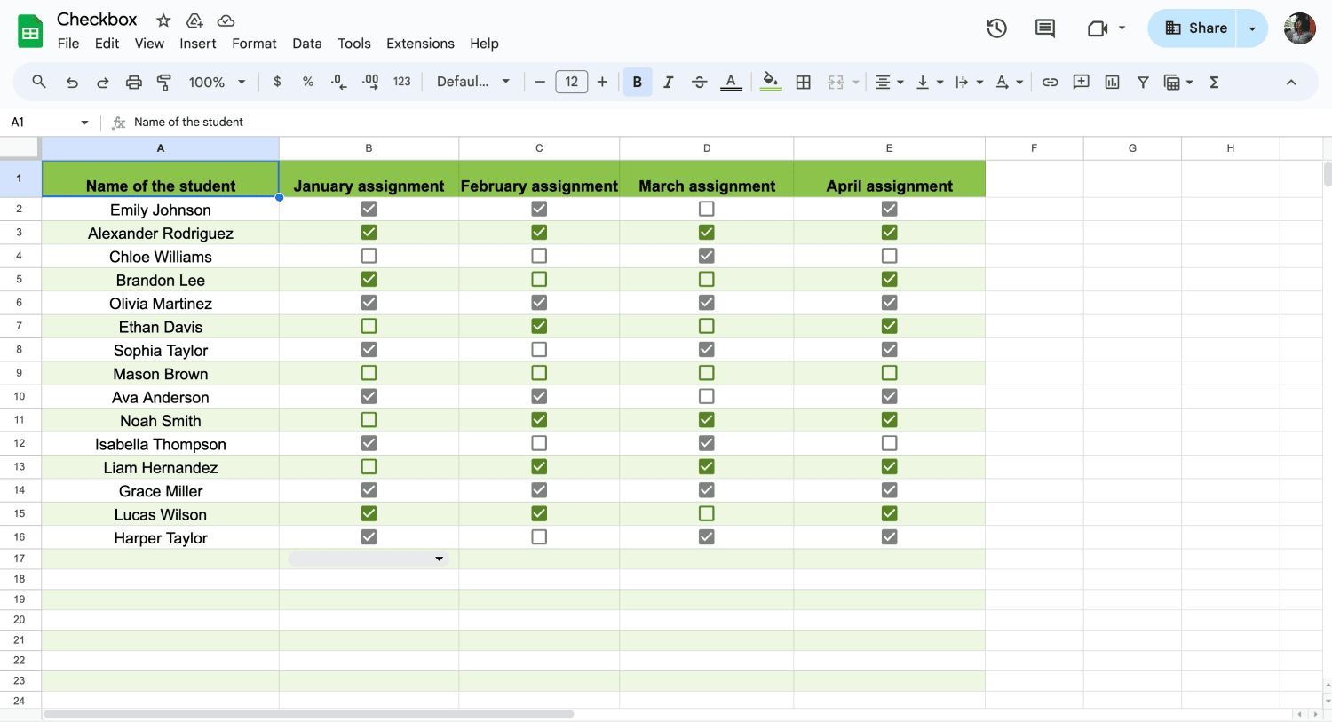 Add Checkboxes them by going to Insert > Checkbox in the menu. They are perfect for tracking task completion or yes/no responses across multiple sheets. You can pair checkboxes with conditional formatting to highlight completed tasks. They also work well with formulas to calculate progress or filter checked items.