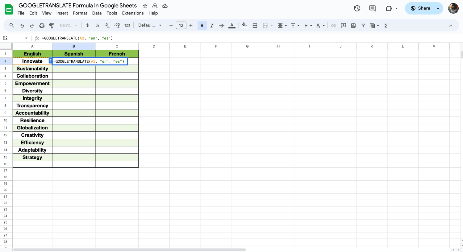 the GOOGLETRANSLATE function