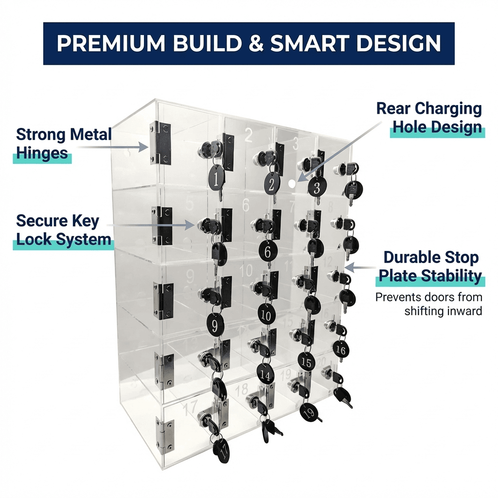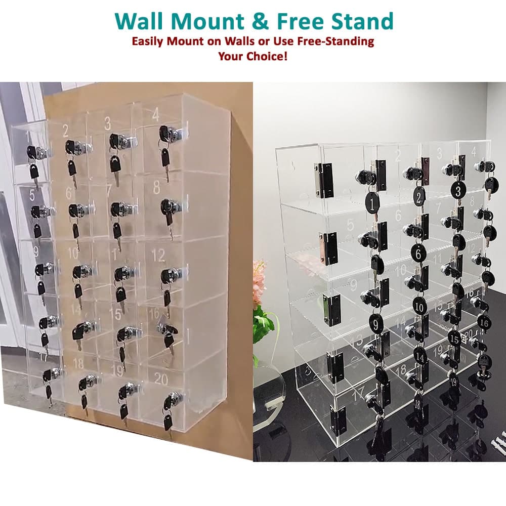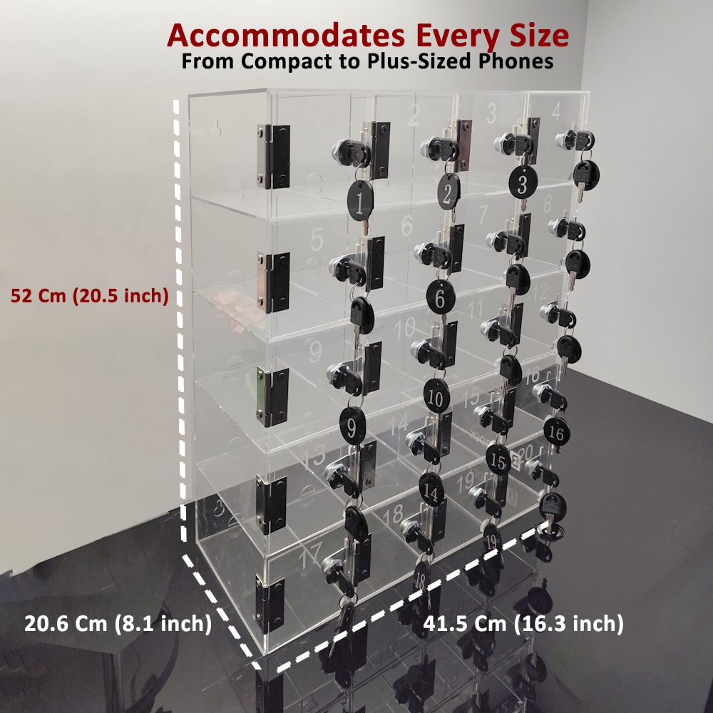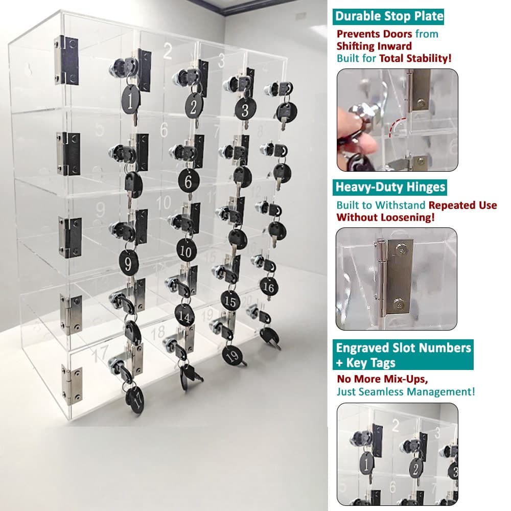 Designed this clear acrylic lock box for daily use. Its construction is sturdy and includes metal hinges and an enhanced stop plate to provide added durability. The translucent material permits managers to view the slots in a single glance, without having to unlock each slot. It’s perfect for establishments that require security that is tamper-proof, easily easy to maintain security device for phones.