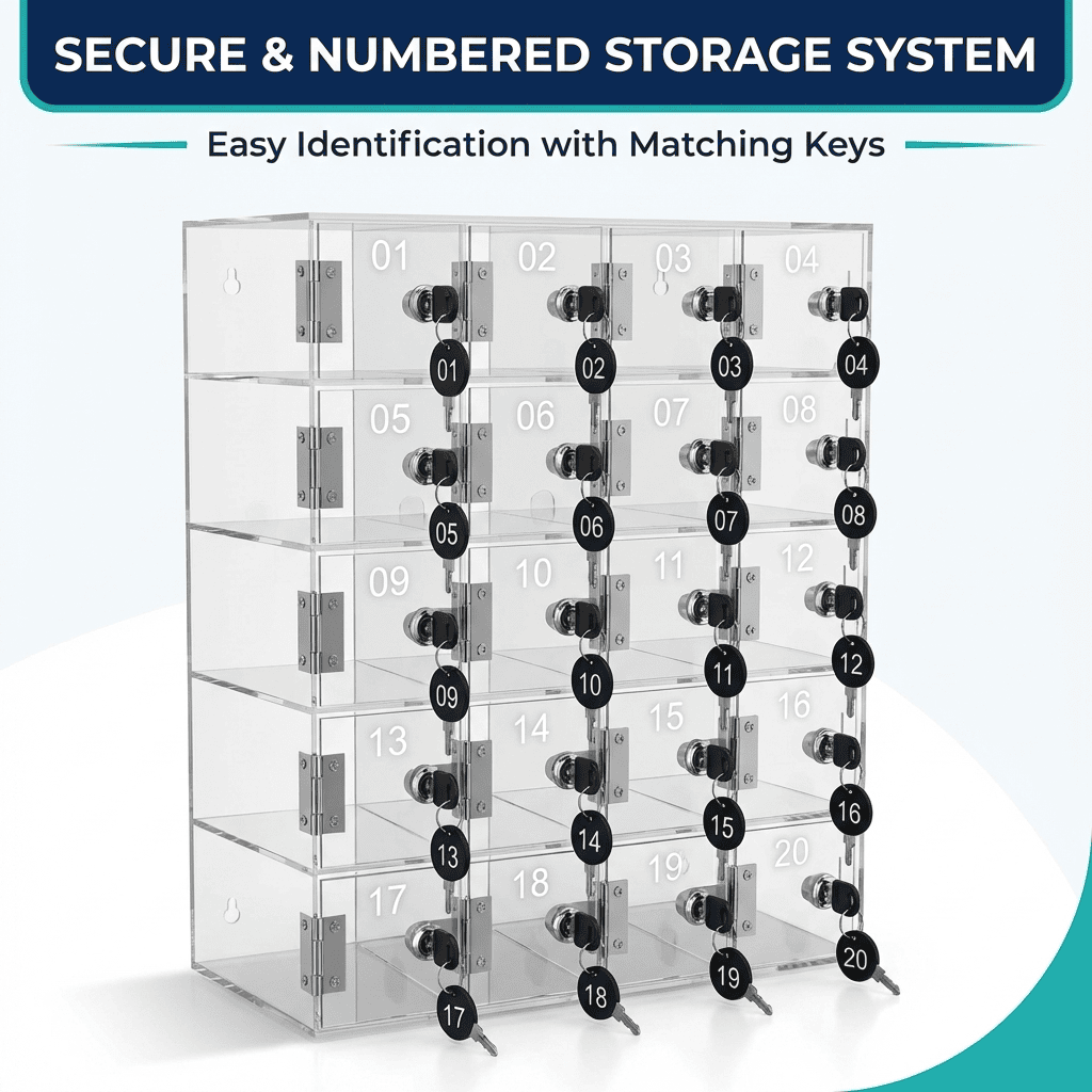 This phone locker has numbered keys for each slot. It makes it simple to locate and retrieve phones. These are especially useful in shared spaces where multiple users require secure, distinct storage. It reduces confusion and simplifies return of devices. It also increases the personal accountability of people using the device.