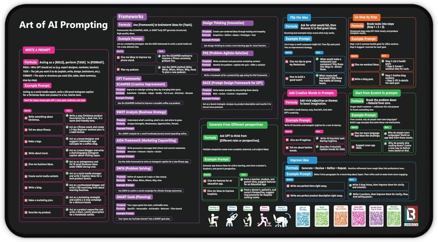 The AI Prompt Cheat Sheet Desk Mat is a smart tool for anyone who wants to learn how to write effective prompts while keeping their workspace organized. Whether you’re studying, programming, designing, or creating content, you’ll always have AI frameworks and examples at your fingertips. It encourages consistent learning and experimentation, making it an ideal accessory for remote workers, students, and AI enthusiasts.